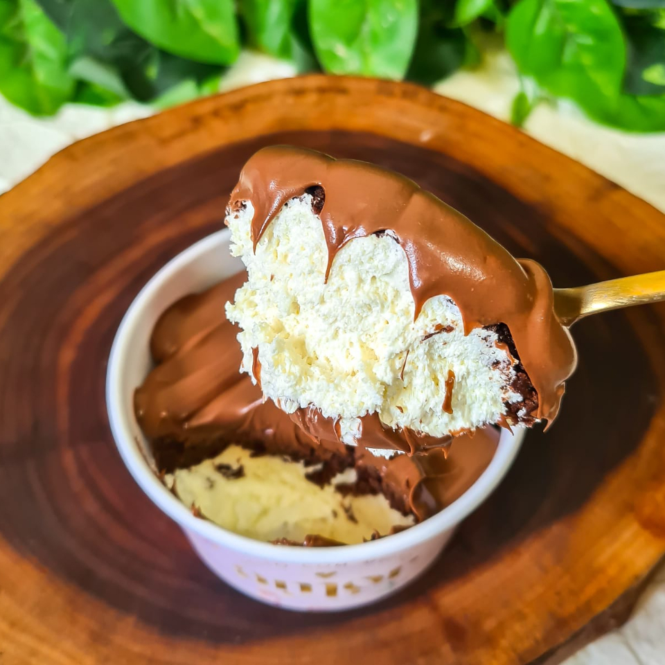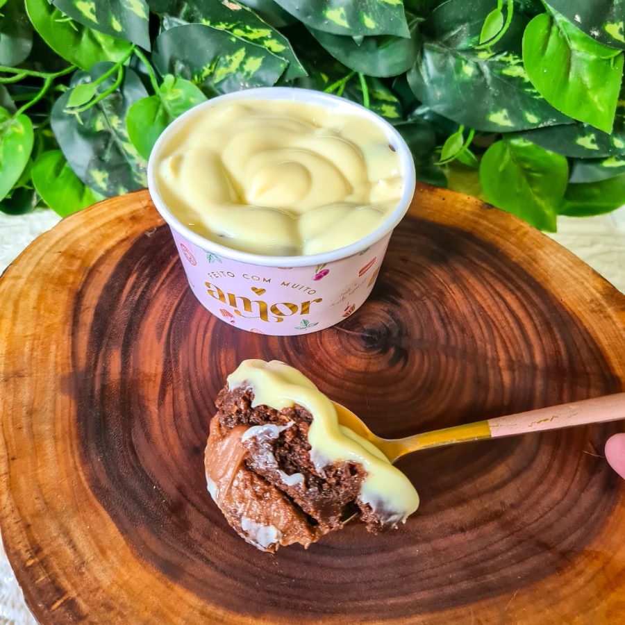 Camada de brigadeiro belga, brownie molhadinho e cremoça. Pode esquentar por 30seg no microondas.