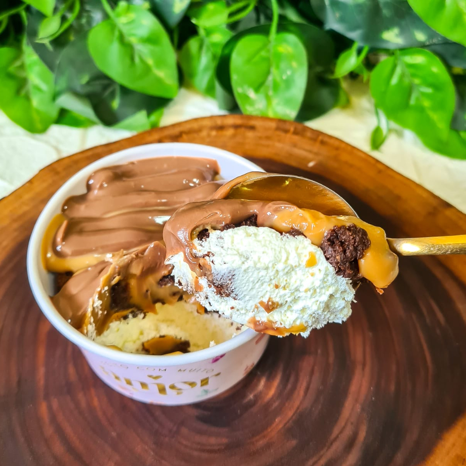 Nosso delicioso brownie, intercalado uma mousse de Leite Ninho, que adiciona um toque de suavidade e doçura. Mas não para por aí, como a cereja do bolo, temos a genuína Nutella, com seu sabor de avelã e chocolate que derrete na boca, transformando cada colherada em um momento de puro prazer. É o deleite perfeito para os amantes de doces!