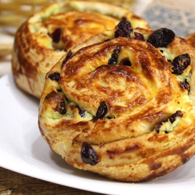 Massa folhada tradicional francesa com recheio de creme de confeiteiro e uvas passas.