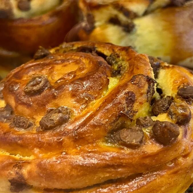 Rool com Massa Artesanal com Gotas de Chocolate e Creme de Confeiteiro. Aprox 200g