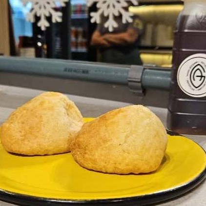 2 unidades do pão de queijo tradicional feito com queijo canastra acompanhado do Mate da casa com limão