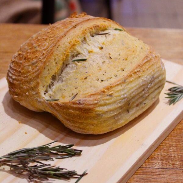 Pão Sourdough com Azeite e Alecrim de Fermentação Natural ,com aproximadamente 400 gramas. Pode haver alteração de aproximadamente 10% no peso, devido ao processo de produção artesanal.