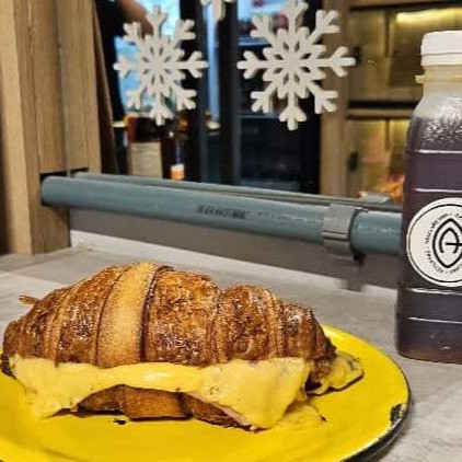 Croissant tradicional francês recheado com queijo e presunto combinado com Mate da casa com limão!