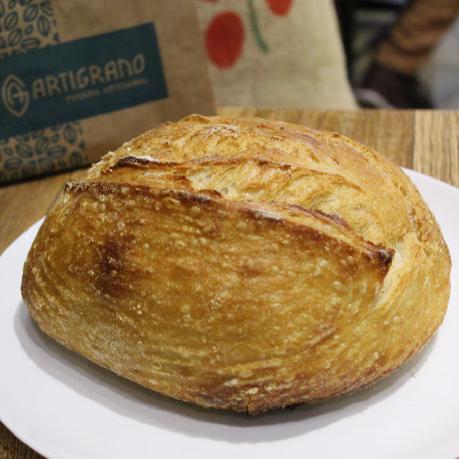 Pão sourdough de fermentação natural de com aproximadamente 420 gramas. Pode haver pequenas alterações no peso, devido ao processo de produção artesanal.