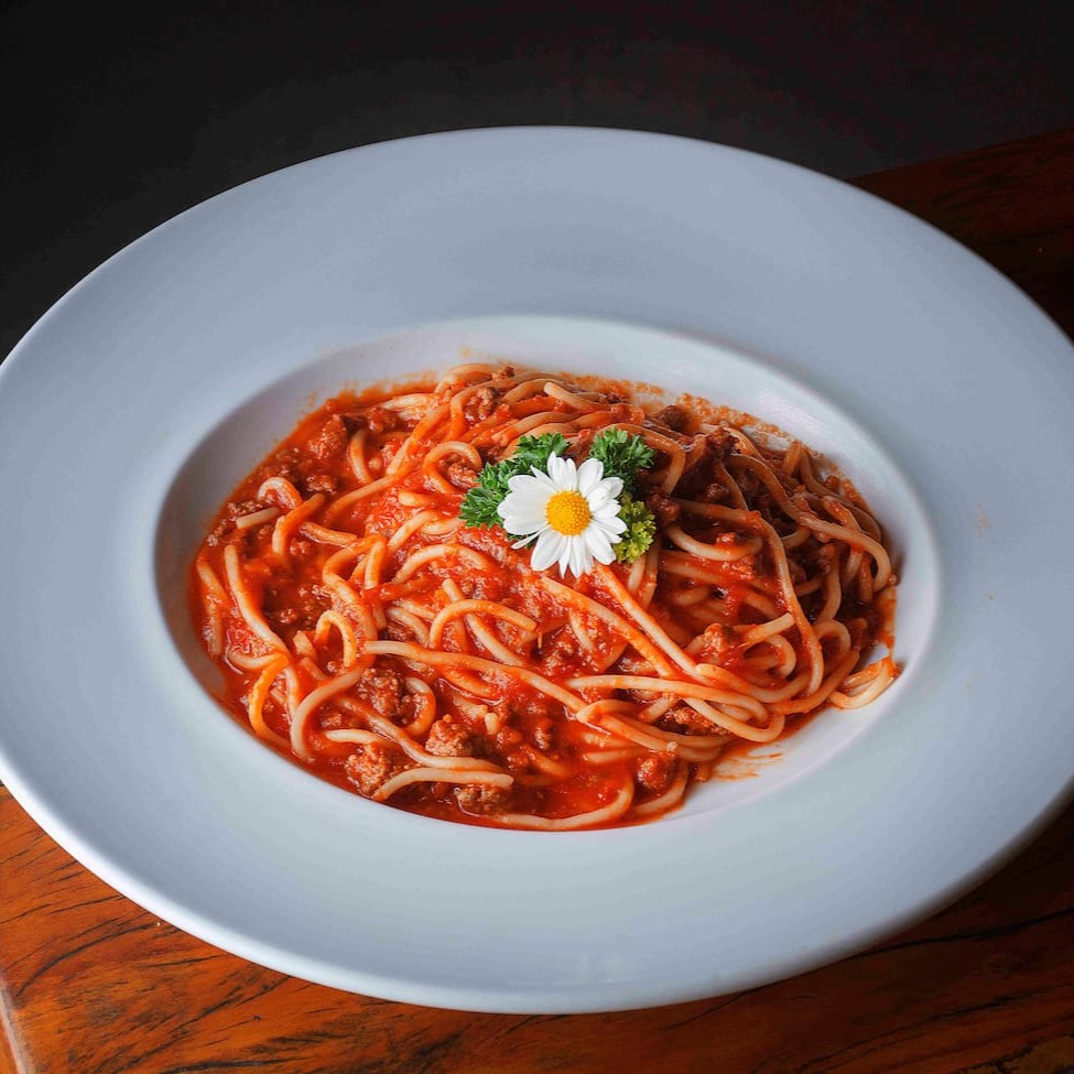 Um prato Clássico de espaguete servido ao molho de Carne bovina Moída e temperada na medida certa refogado no nosso molho de tomate caseiro.