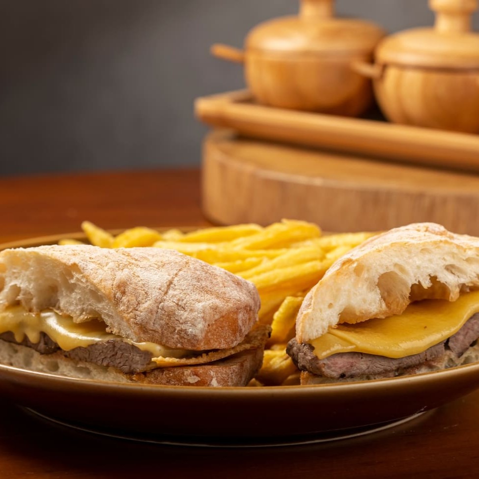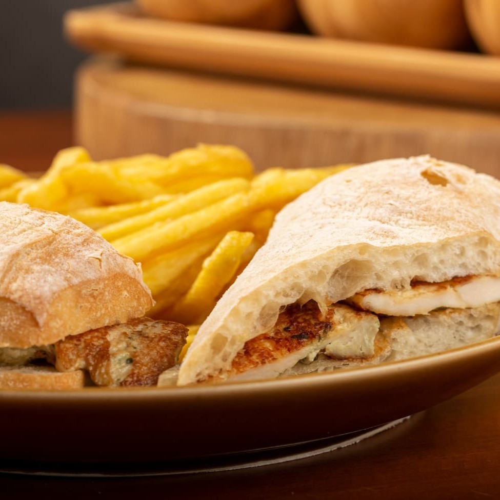 Sanduiche De Filé De Frango C Queijo Prato No Pão Ciabatta+ Batata Frita + Açaí