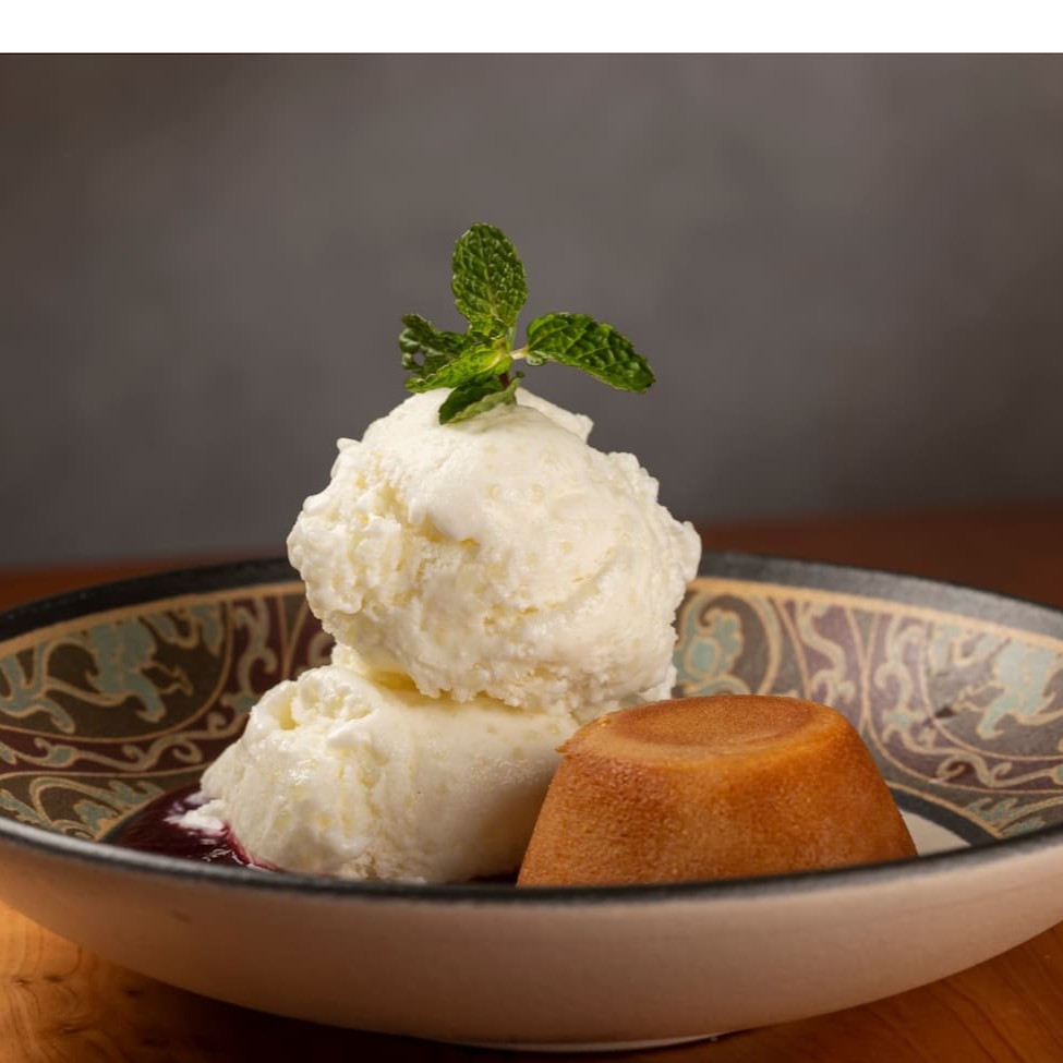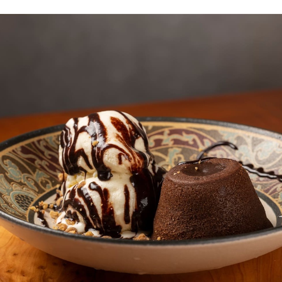 Mini bolo de Chocolate, acompanhado de Sorvete de Creme e farofa de Castanha.