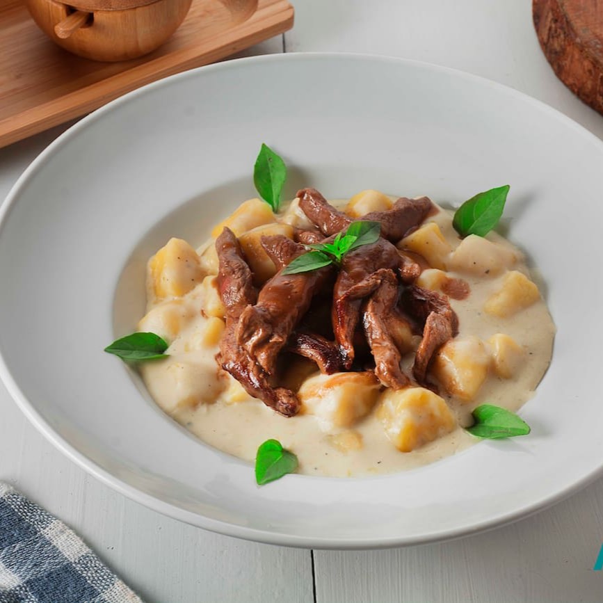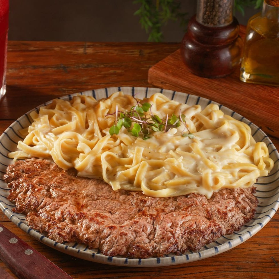 Maravilhoso Paillard de Mignon com Massa Fettuccine ao Molho Quatro Queijos.