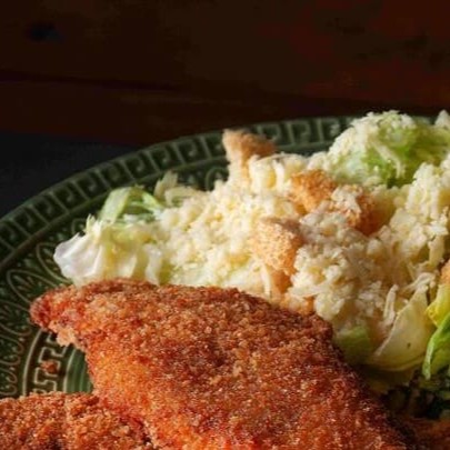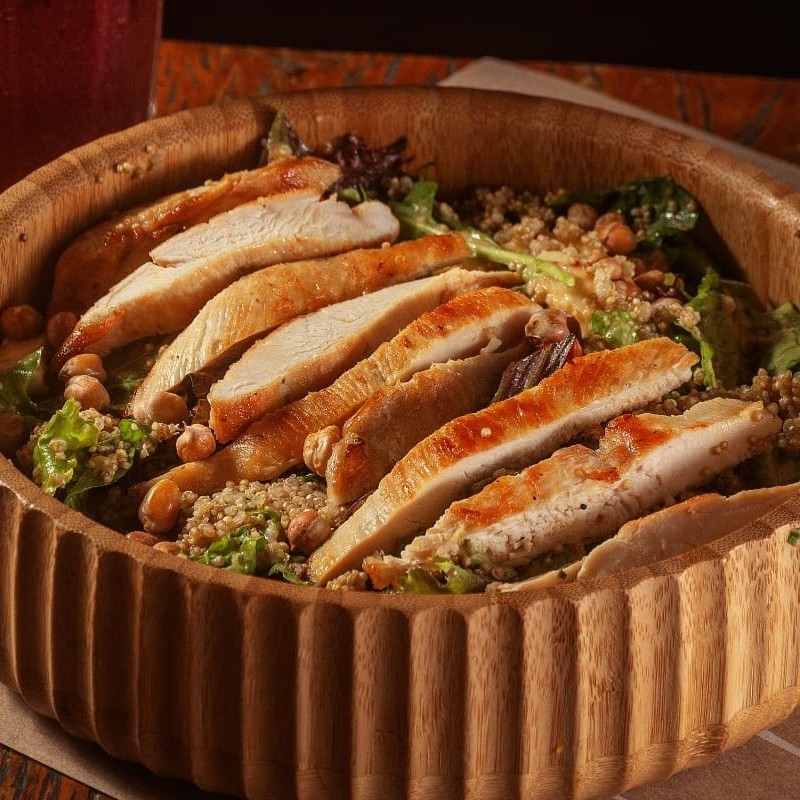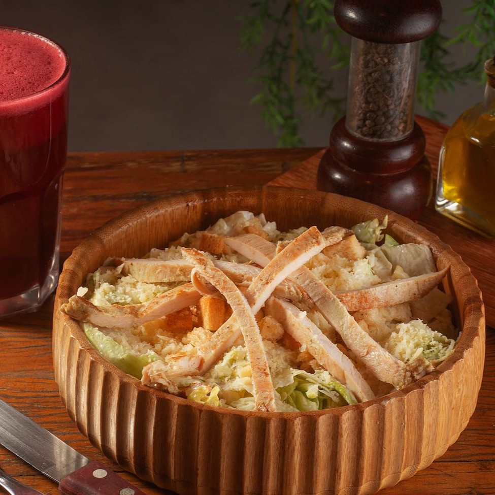 Nossa Tradicional Caesar Salad coberta com Suculentas Tiras de Frango.
