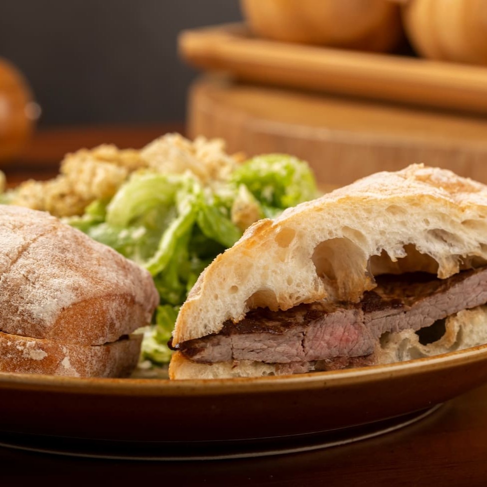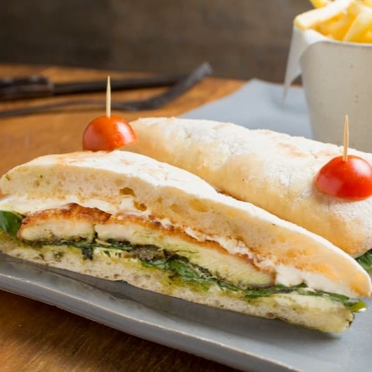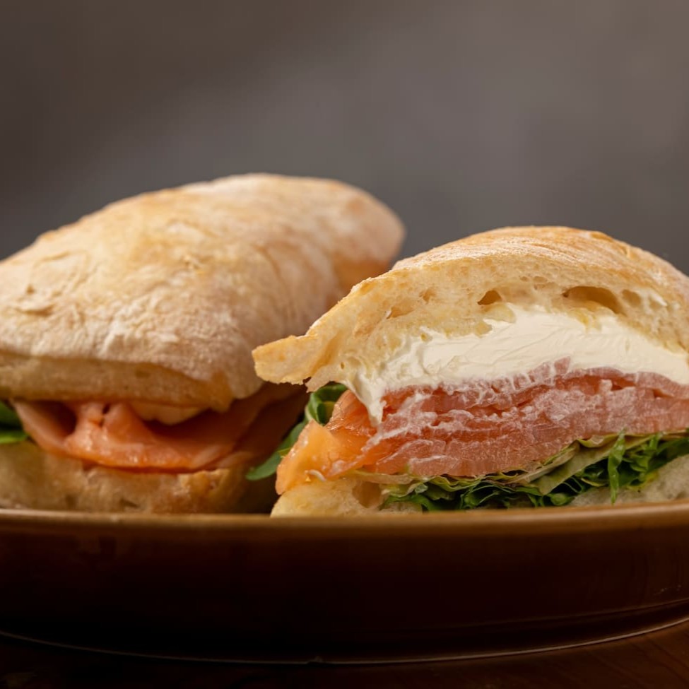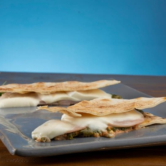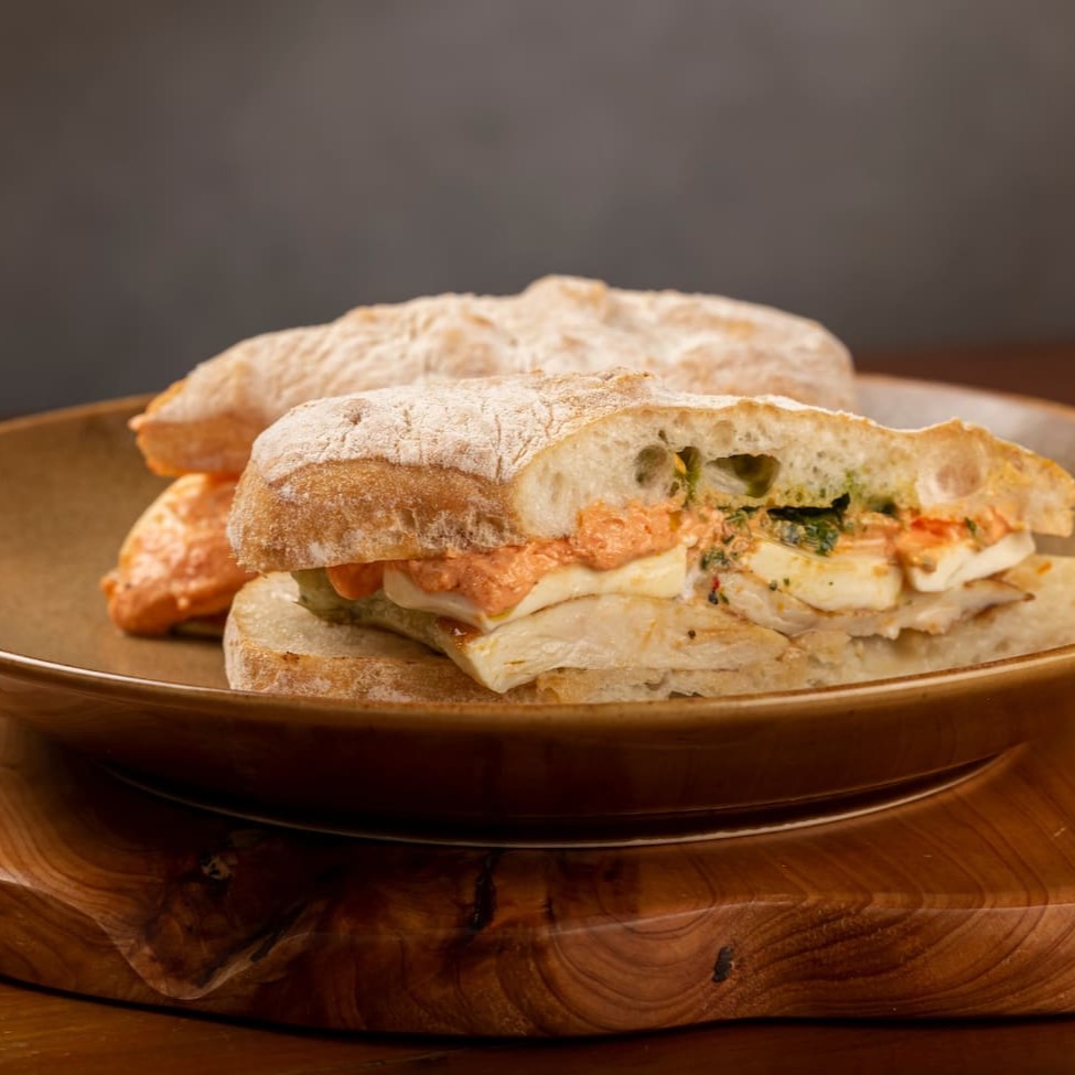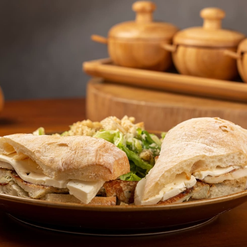 Sanduíche composto de uma Saborosa Pasta de Tomate Seco, Peito de Peru, queijo minas padrao e Molho Pesto.