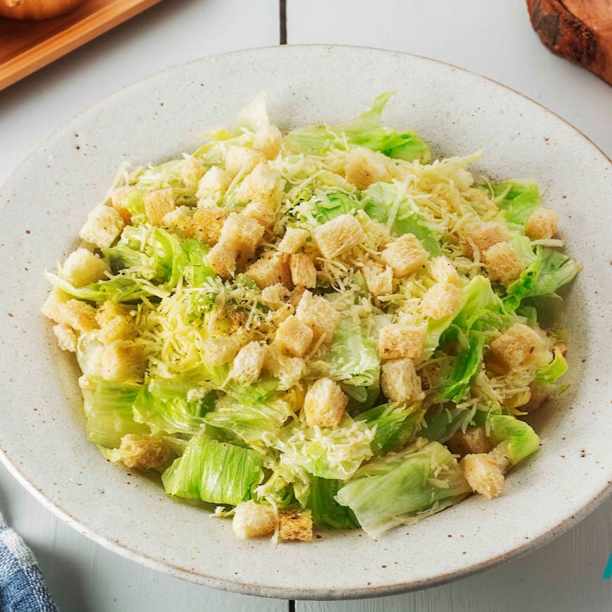 Uma Deliciosa Salada Leve composta de folhas de Alface, Parmesão, Croutons e Molho Tradicional.
