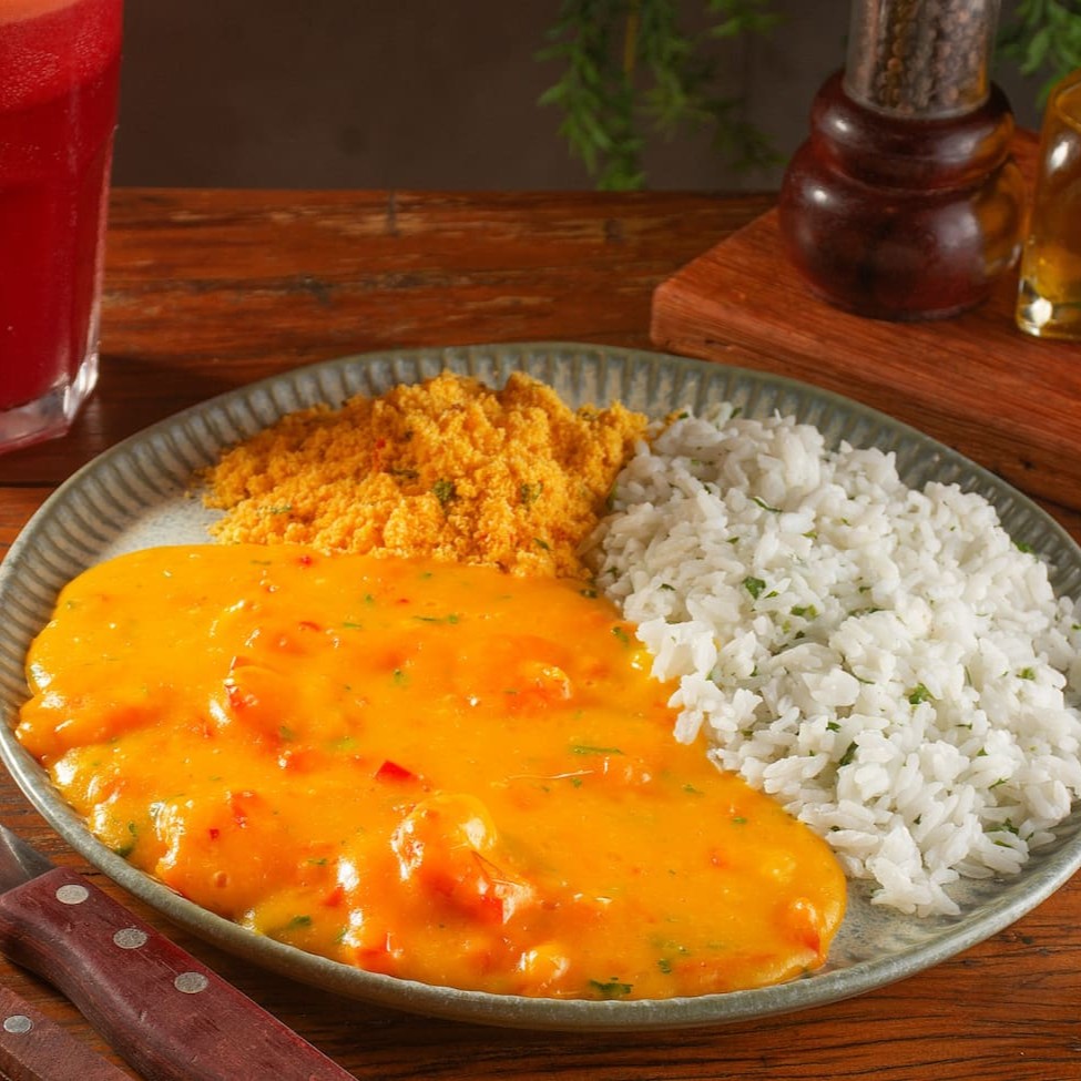 Maravilhoso prato cremoso feito à base de mandioca, com suculentos Camarões. Bobó + Arroz de Coco e Farofa de Dendê.