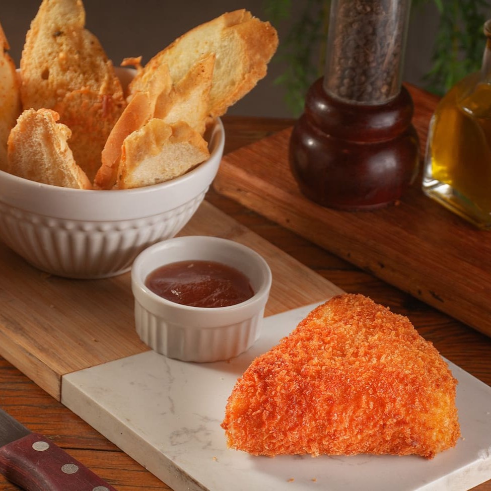 Delicioso Queijo Brie Empanado, acompanhado de Torrada e Geléia de Pimenta.