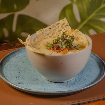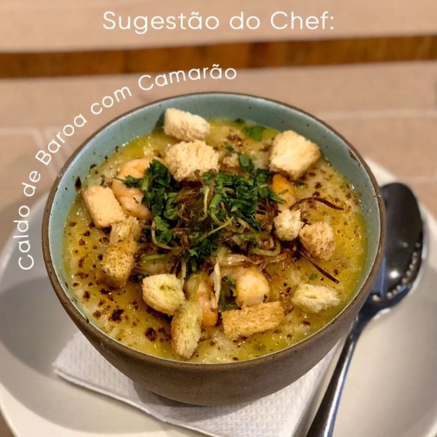 Um caldo Cremoso e Saboroso com Camarões Frescos que conferem um sabor delicioso.