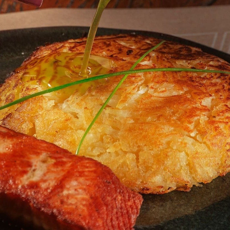 Salmão com batata doce rostie recheada com queijo minas padrão, finalizada com molho pesto