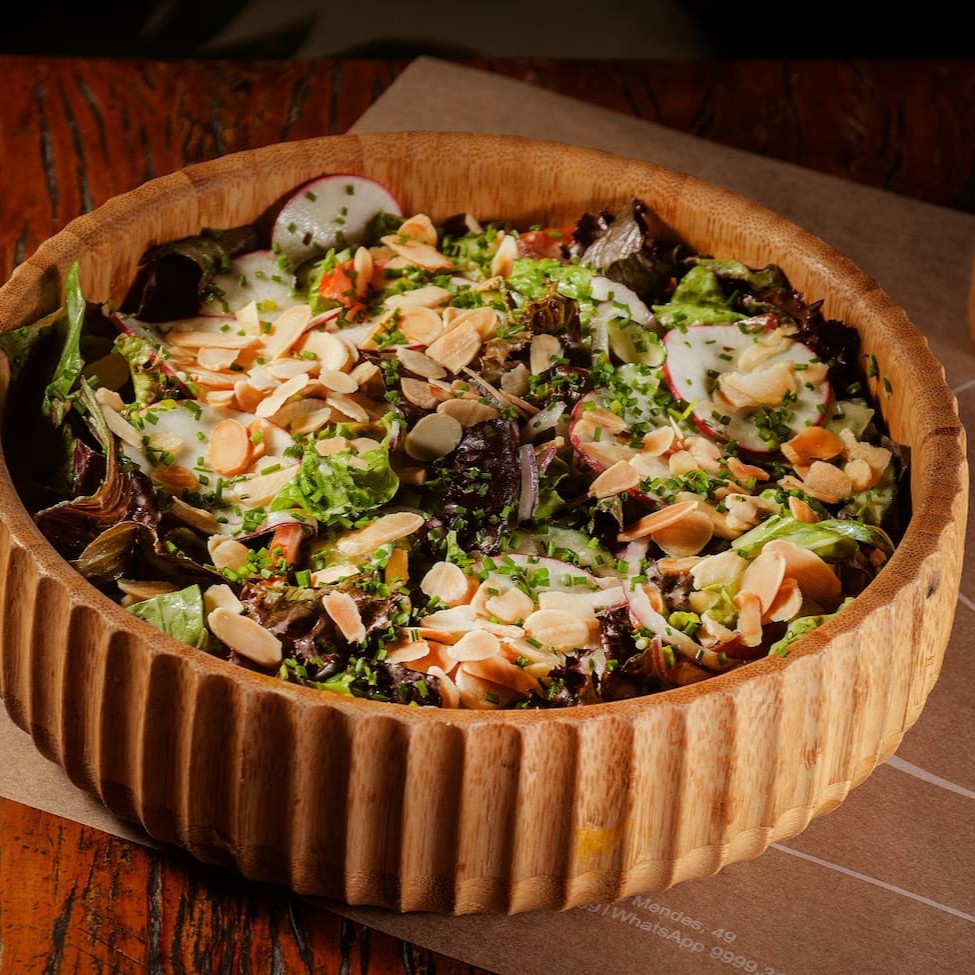 Alface crespa, alface roxa, cebola roxa, tomate, pepino, lascas de amêndoa, rabanete e molho honolulu