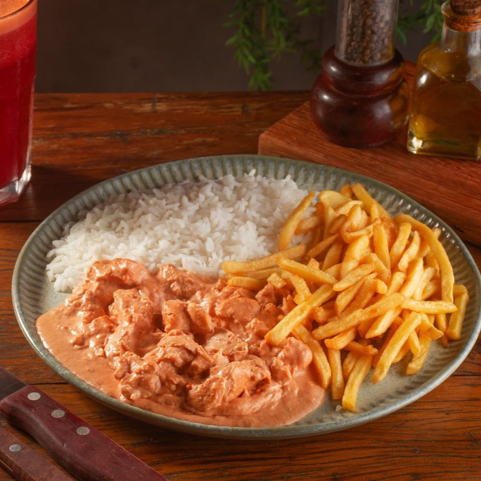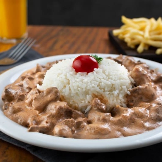 Prato Delicioso e Tradicional!! Servido com arroz branco e batata frita na hora. --- Estrogonof, Estrogonofe, Strogonof,
