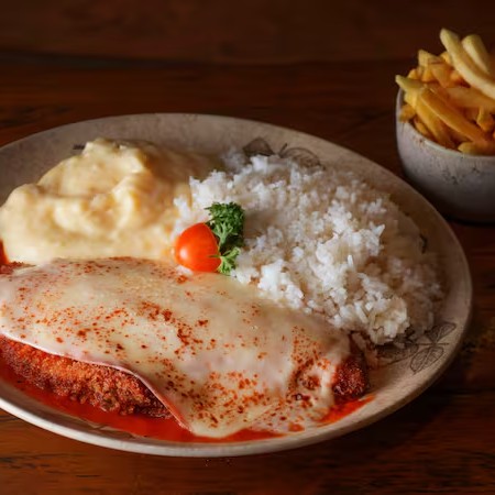 Deliciosamente preparado com Filés de Frango Macios e Suculentos, cobertos com uma generosa camada de Queijo Derretido e Molho de Tomate encorpado, cada garfada é uma explosão de sabores