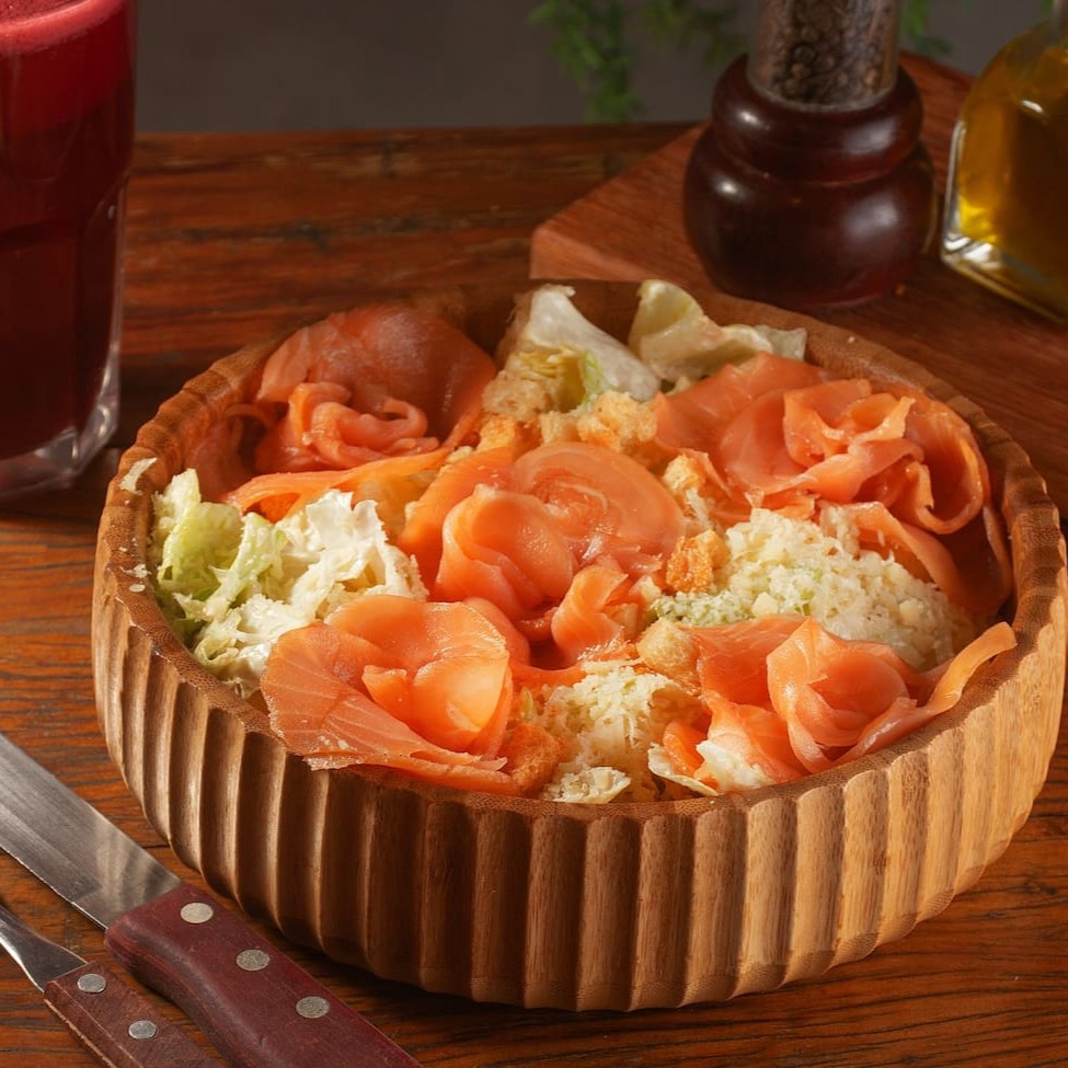 Caesar Salad coberta em Tiras de Salmão Fresco Defumado.