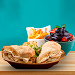 Sanduiche de filé de frango com queijo prato no pão ciabatta acompanhado de batata frita + Açaí 300ml.