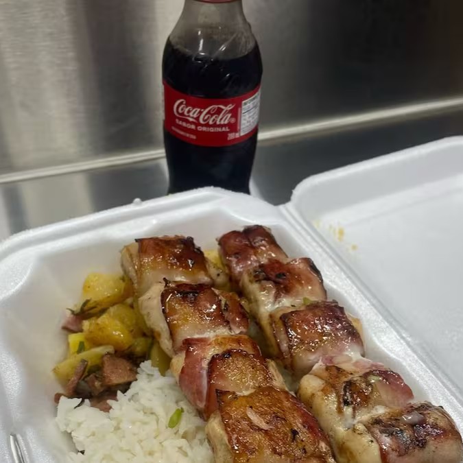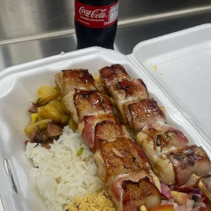 Arroz branco , MAIONESE DE BATATA DOCE, Farofa, Molho + 2 Espeto Misto + Coca cola 200ml