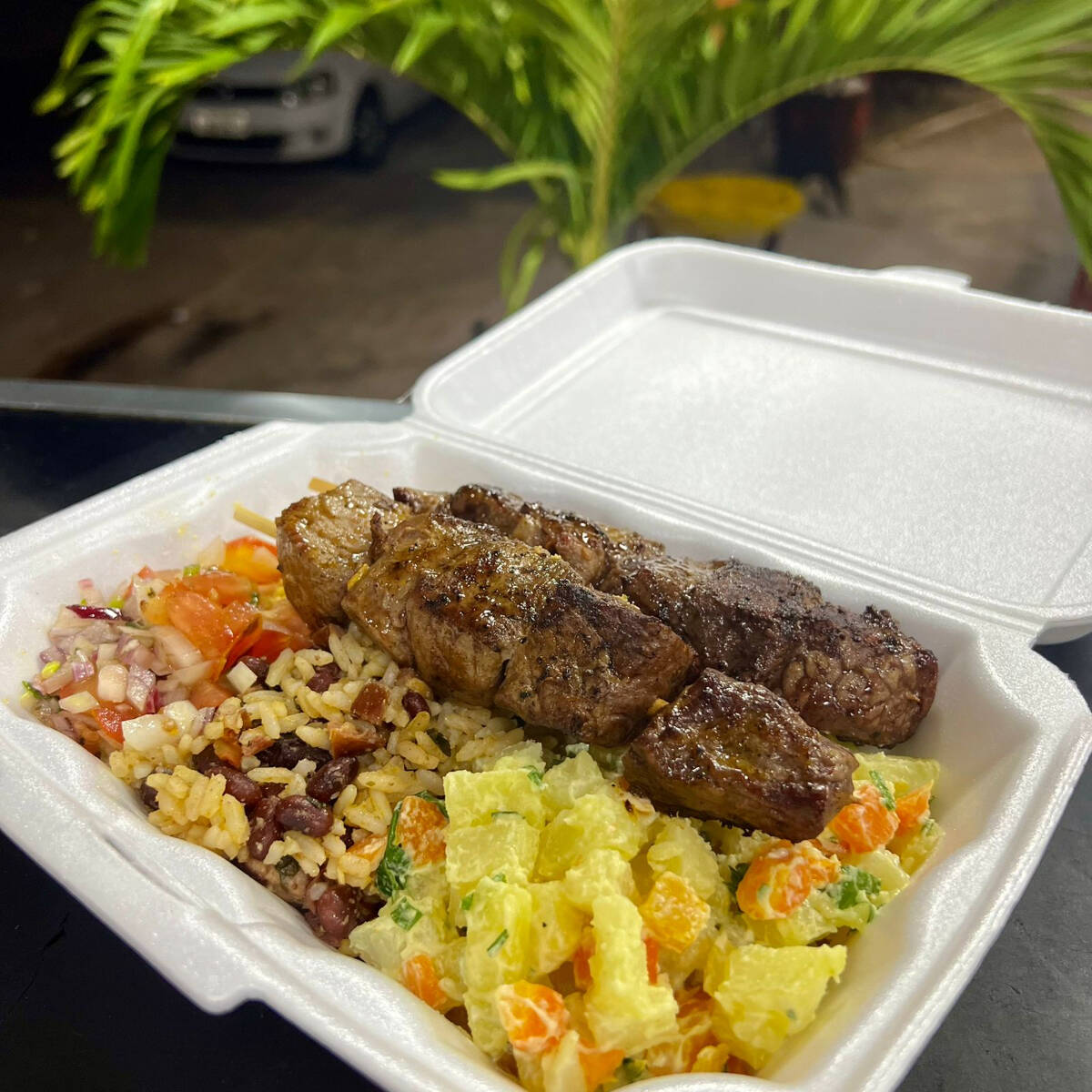 2 refeições arroz ,MAIONESE DE BATATA DOCE, Farofa, molho já com cada espeto a sua escolha e coquinha de 200ml