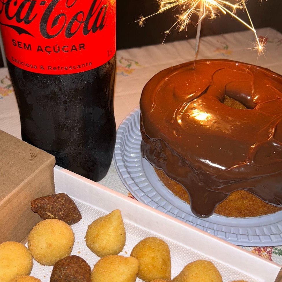 Delicioso bolo piscina de Cenoura com cobertura de Brigadeiro bem cremoso de aproximadamente 25cm e 1kg . Muita cobertura e complemento de sua escolha. Serve 16 fatias. O bolo rende bastante + Coca cola de 2 lts