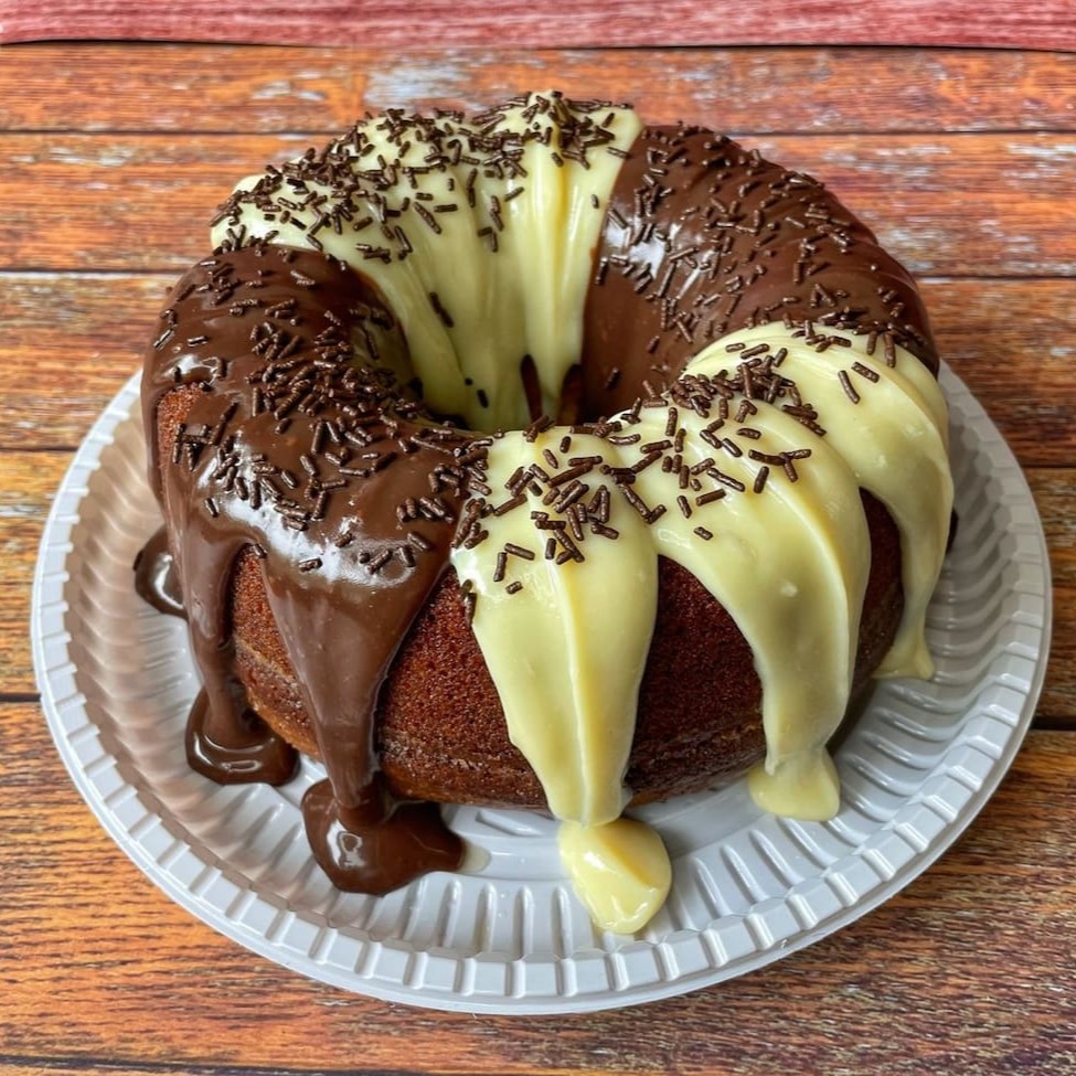 Apresentamos nossa novidade: o Bolo Dois Amores. Com um generoso diâmetro de 20 cm, este bolo é uma delicada combinação de sabores. Cada fatia revela uma massa divinamente equilibrada, com metade de rico chocolate e metade de um suave leite. Sua cobertura é uma maravilha à parte, composta por um sedutor brigadeiro e um doce leite condensado, delicadamente dispostos em partes iguais. Um verdadeiro