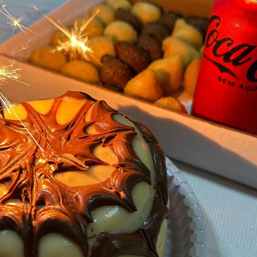 Delicioso Bolo com Muuuuuita Cobertura + 25 Salgadinhos crocantes e sequinhos. Na compra do Combo promocional você ganha de graça 1 Refrigerante 1.5l e uma Vela de Aniversário. Tudo feito com muito amor e carinho e com selo de qualidade Ateliê. (Promoção por tempo limitado)