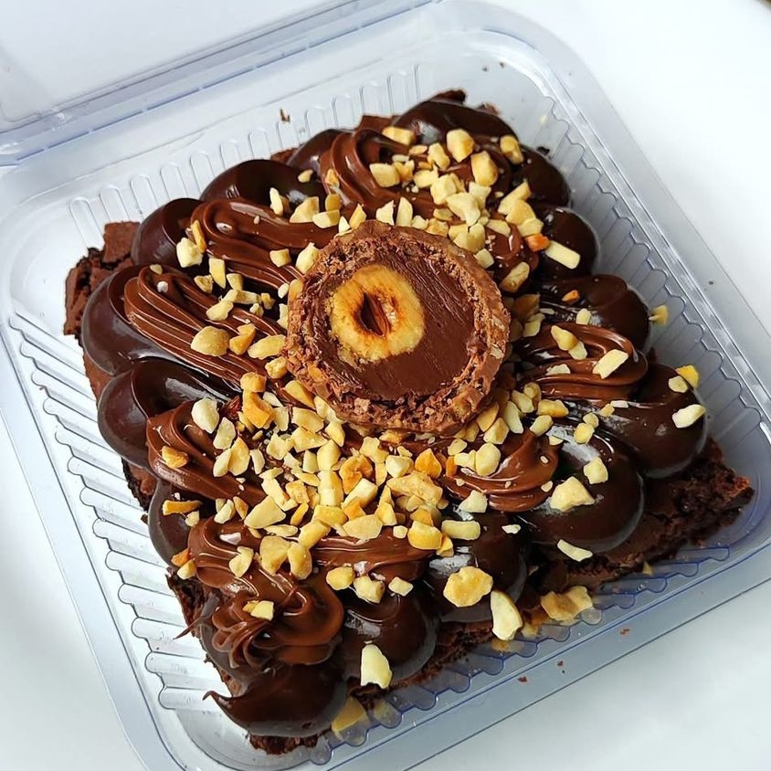 Um pedaço de Brownie com recheio de Chocolate e fios de Nutella, finalizado com granulados de amendoim e Ferreiro Rocher! Irresistível!!!