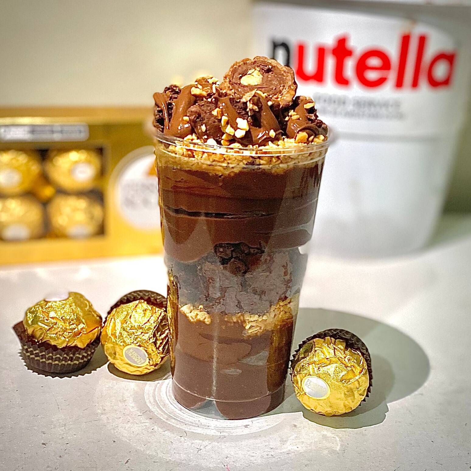 O Copo que vai Mudar seu Dia! Prepare-se para uma explosão de sabor! Camadas generosas de brigadeiro e do mais puro creme de avelã Nutella, pedaços de brownie molhadinho, e para coroar, o inconfundível Ferrero Rocher com amendoins crocantes. É felicidade a cada colherada!