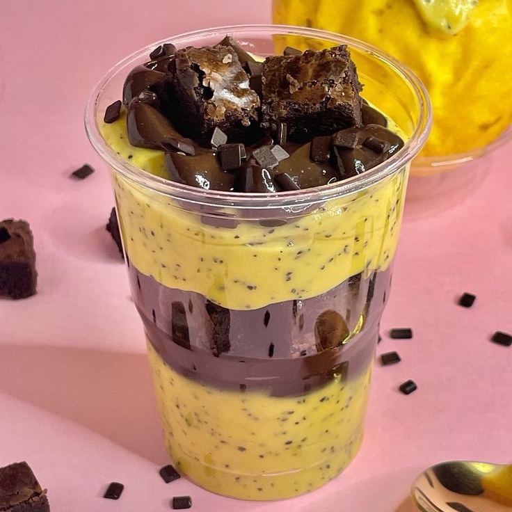 O Equilíbrio Perfeito . Prepare-se para se apaixonar! Intercalamos camadas generosas do nosso brigadeiro cremoso de maracujá (com aquele azedinho irresistível) com a intensidade do brigadeiro de chocolate 50% cacau. Para finalizar com chave de ouro: pedaços de brownie molhadinho e uma chuva de chocolate. A sobremesa que você merece hoje!