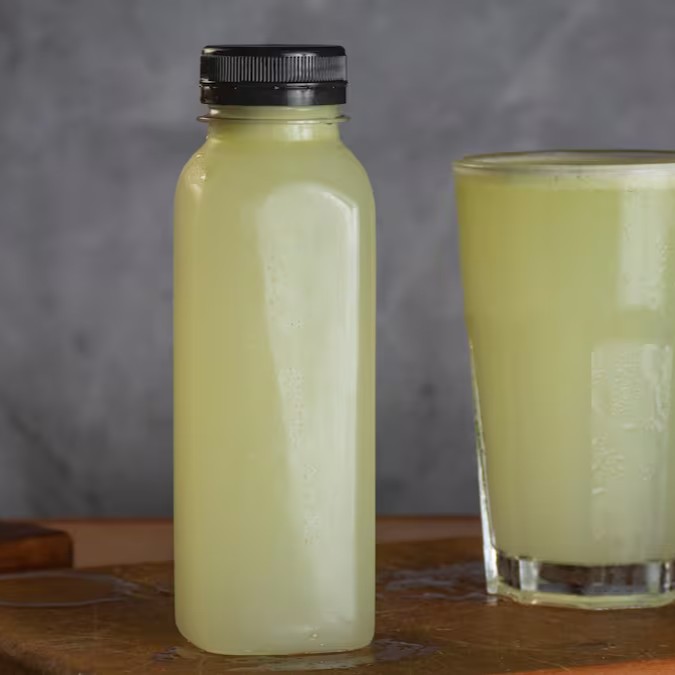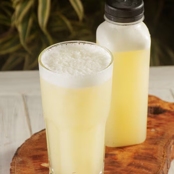 Suco Natural feito com Fruta - Abacaxi, Água de Coco, Gengibre, Couve e Hortelã.