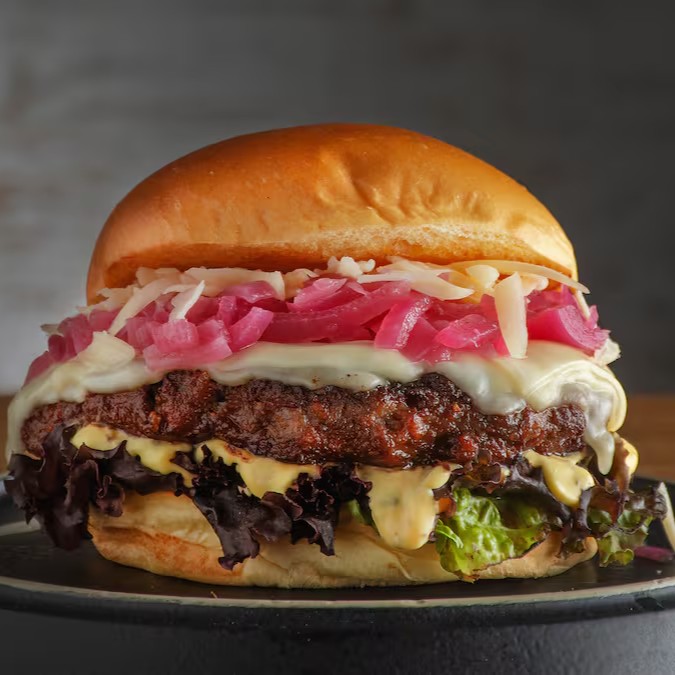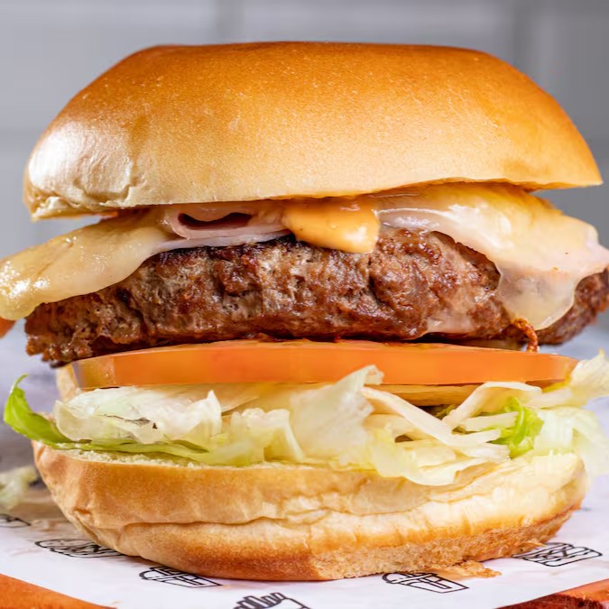 Saboroso Blend de Angus 180g, duo queijo meia cura com grana padano, tomate, cebola refogada e alface roxo com molho americano em um macio pão de brioche.