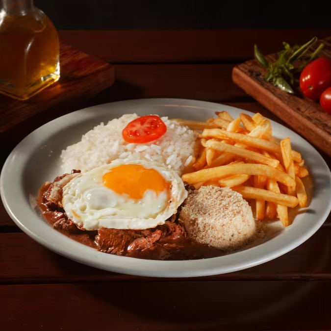 Picadinho de carne super saboroso servido com Arroz Branco soltinho, Farofa da casa, Fritas sequinhas, Ovo Frito e Molho Madeira.