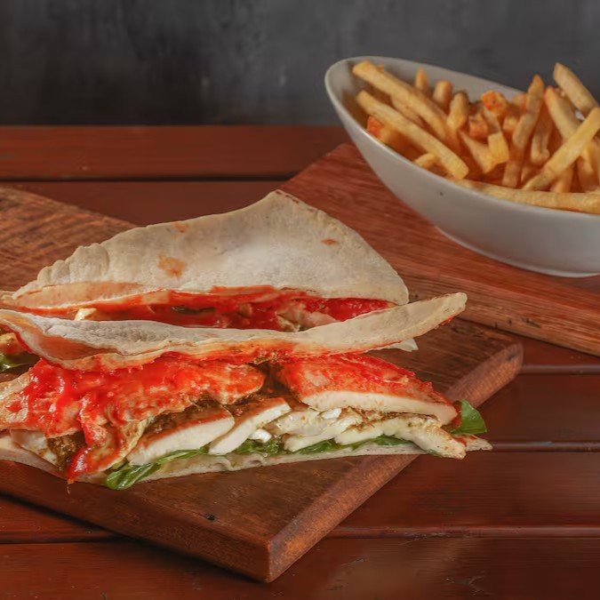 Servido no pão árabe ou brioche, alface, tomate frescos, queijo meia cura e molho americano.