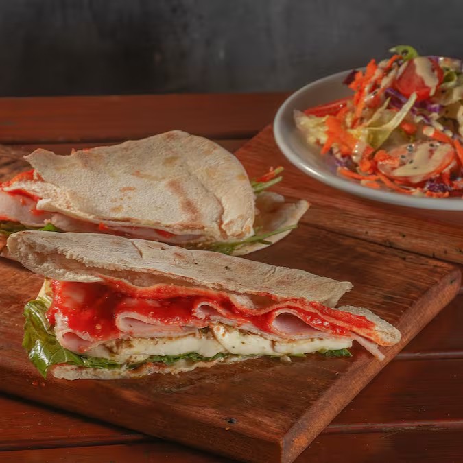 Sanduíche feito com generosas fatias de Presunto, Mussarela de Búfala, Tomate em rodelas, Rúcula fresca e uma pitada de Molho Pesto.