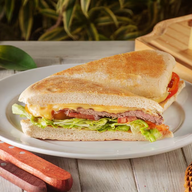Sanduíche de Filé Mignon, acompanhado por Queijo Alface fresca e Tomate maduro. Uma combinação irresistível de sabores e texturas.