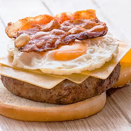 Saboroso Blend de Angus 180g, coberto c/ queijo , ovo frito, fatias de bacon sequinhas e crocantes, tudo isso no macio pão brioche.