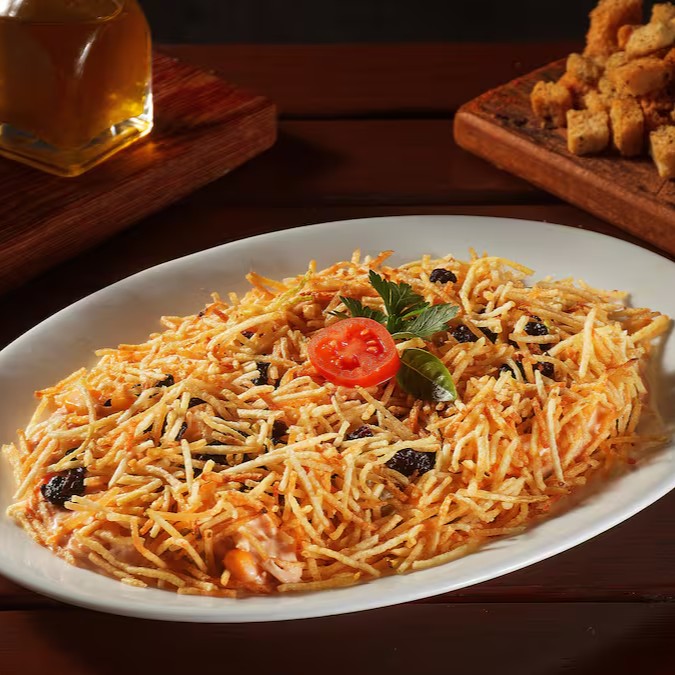 Salpicão de Frango: Delicioso Frango temperado e desfiado, misturado com Cenoura, Passas, ervilha, Milho e Batata Palha.