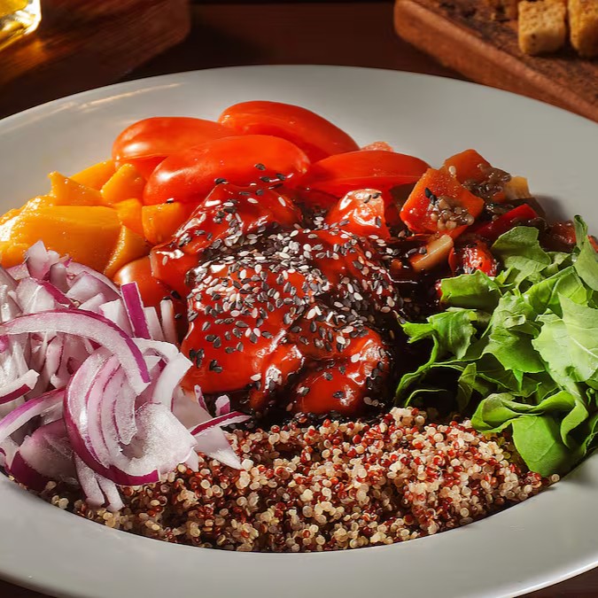 Salada Tropical de Quinoa em Grãos, Cubo de Salmão cru ao Molho Oriental, coberto com Gergelim Torrado, Legumes assados, Manga, Tomate Cereja e Cebola Roxa.