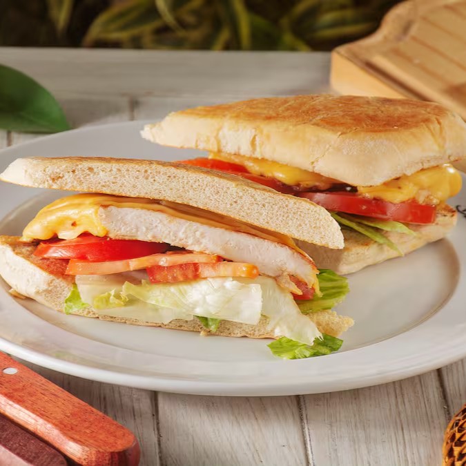 Sanduíche com Filé de Frango com uma textura Suculenta e Grelhado à perfeição, Pão levemente tostado, alface, tomate e muito Queijo.
