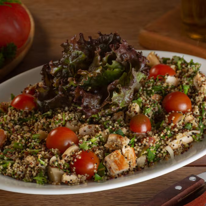 Salada com Quinoa, Tomate Cereja, Rúcula, Castanha do Pará, cubos de Frango Grelhado, raspas de Limão e Quinoa Crocante.