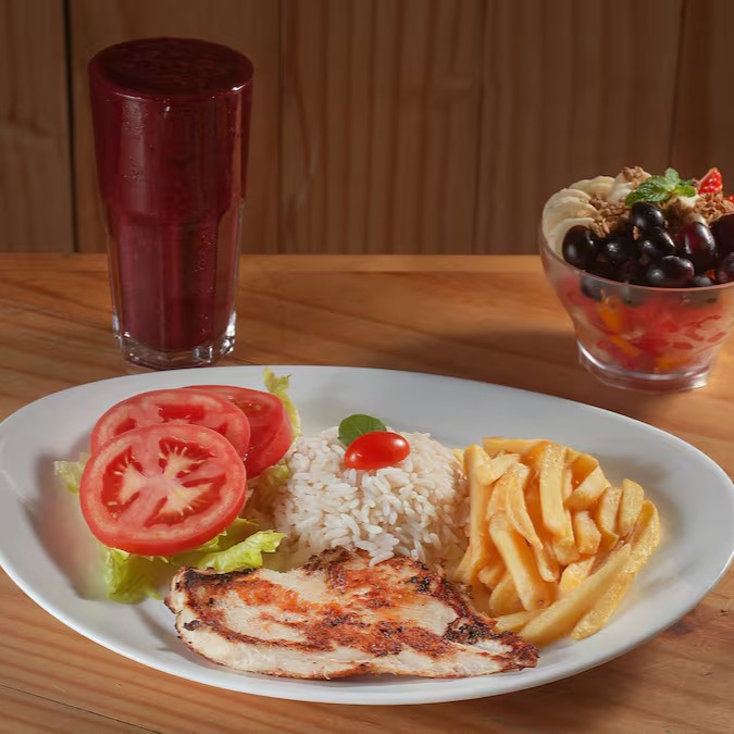 Delicie-se com o frango preparado com temperos brasileiros, suculento e irresistível. Servido com Arroz Branco soltinho, Feijão fresco, Fritas sequinhas e Deliciosa Farofa da casa ou Salada. Acompanhe com uma salada de frutas frescas com sabores naturais e para completar, escolha a sua bebida favorita. Uma combinação perfeita de prato principal, sobremesa e bebida para uma refeição balanceada e cheia de sabor.