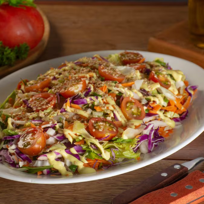 Salada Verde, composta por Alface Americana, Rúcula, Cenoura, Acelga, Repolho Roxo, Tomate Cereja, Gergelim e nosso saboroso Molho Ranch.
