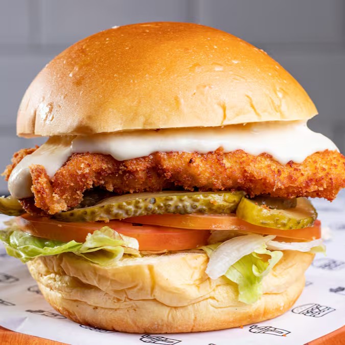 Delícioso Frango Crocante montado com: Fondue de Queijo, Alface, Tomate e Picles! Servido no Pão de Brioche e acompanha porção de Batata Frita (150g) e uma Bebida Geladinha