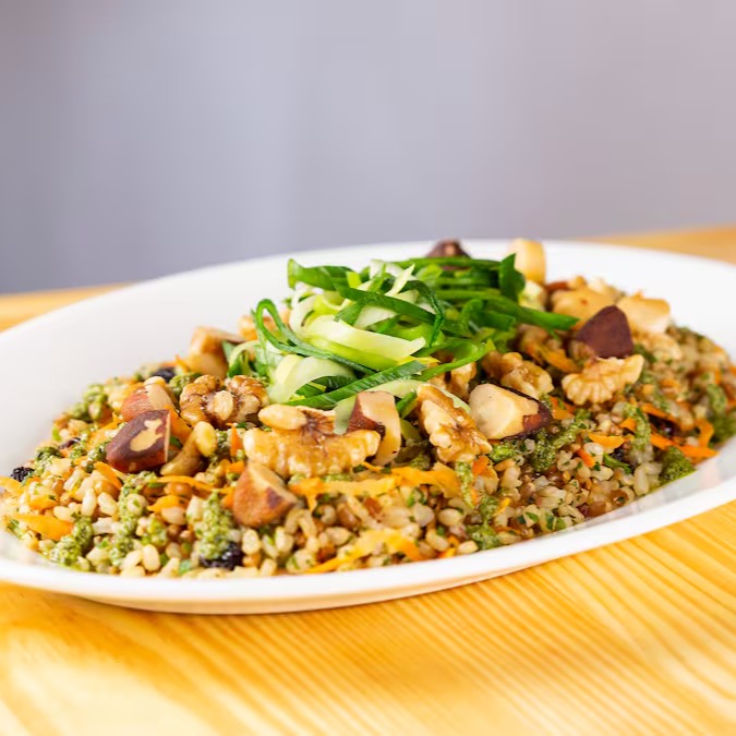Salada nutritiva com, Arroz cateto integral, trigo em grãos, nozes, castanha do pará, molho pesto e alho poró.