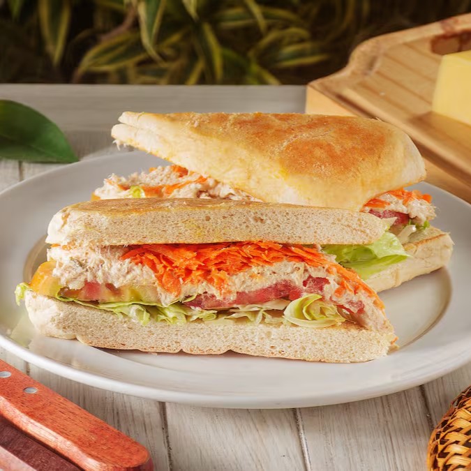 Tradicional Sanduíche com Pasta de Frango, acompanhada de Cenoura Ralada, Alface fresca e Tomate maduro. Uma opção clássica e saborosa.