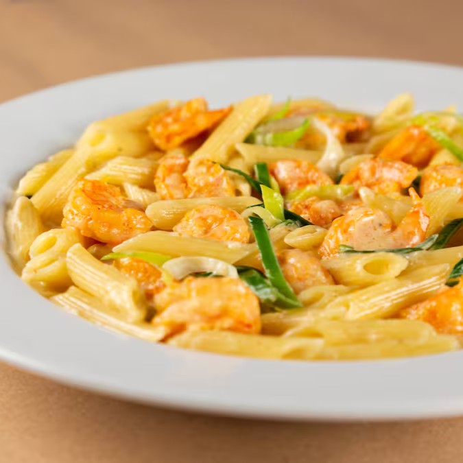 Irresistível prato de Macarrão Penne, envolto em um cremoso molho branco, destacando a perfeita combinação de camarões generosos e Alho Poró.