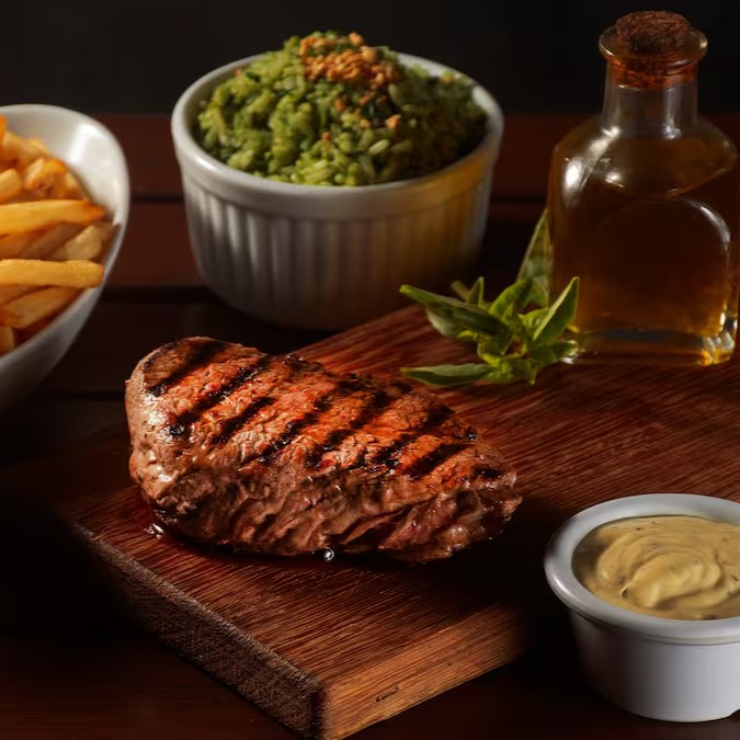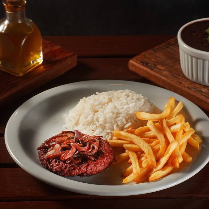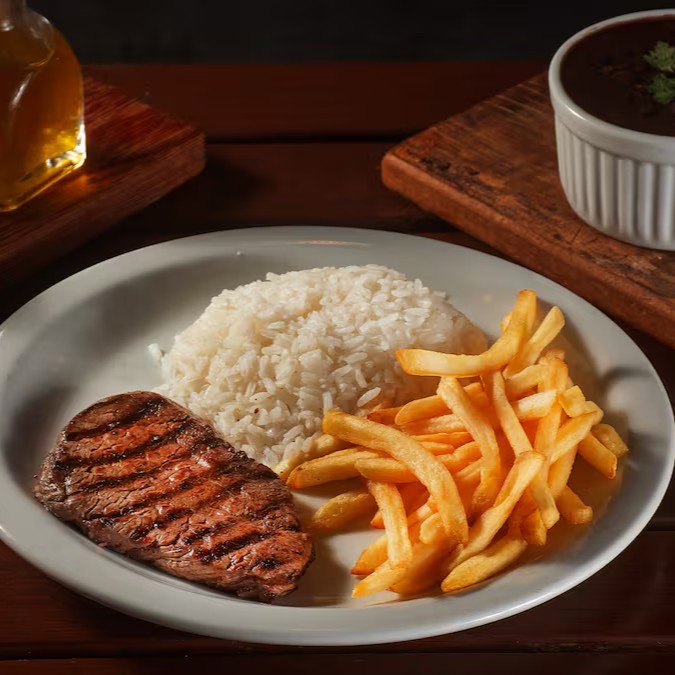 Saboreie um prato incrível com Filé Mignon, Arroz, feijão e Fritas e escolha entre, Farofa ou Salada.